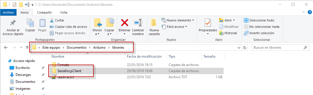 : La instalación de SerialIocp incluye la librería SerialIocpClient para Arduino® en el path por defecto de Arduino® IDE para las librerías de usuario: