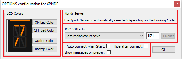 podemos configurar el aspecto y comportamiento que tendrá el Xpndr, la conexión al Xpndro Server, los offset desde los que se obtiene la información de Prepar3D® y el modo en el que IocpXpndr se inicia.