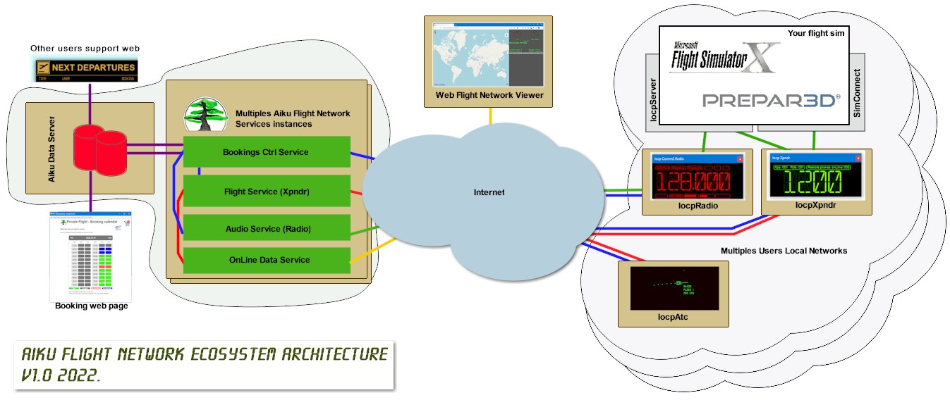 La red de vuelo de Aiku está basada en un modelo Cliente/Servidor con un ecosistema de multiples tipos de servicios y servidores y multiples tipos de clientes con el fin de crear un entorno multiusario rápido y eficaz.