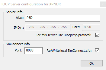 podemos configurar los parámetros de conexión al IocpServer y la información de SimConnect.